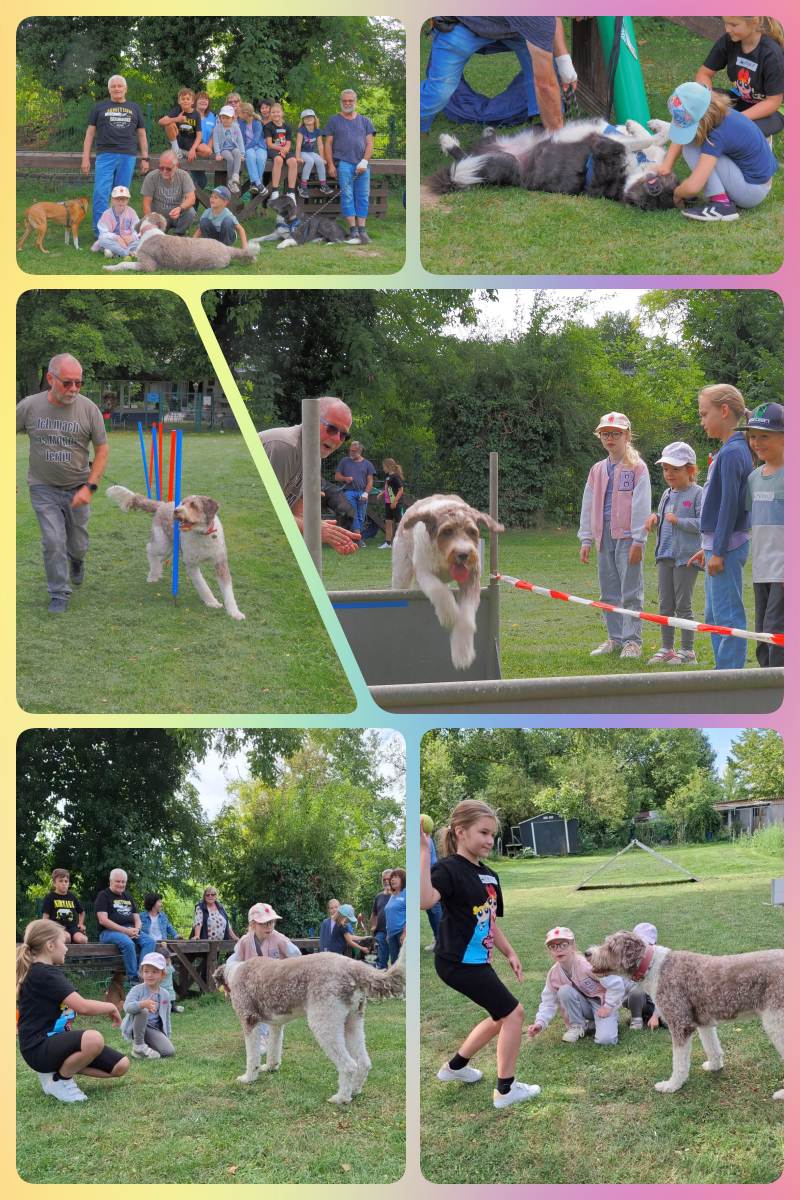 Dann wurde es spektakulär: Uwe mit Dancer und Harry mit Navy präsentierten eine Trickshow, die selbst die Hunde zum Staunen brachte. Slalom, Sprünge, Hindernisse – die Kinder jubelten, die Hunde wedelten, und selbst Kiwi wollte spontan mitmachen (was sie natürlich auch tat – mit Stil und Schnauze).